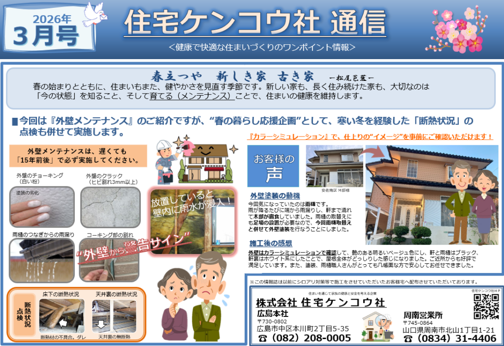 【ケンコウ社通信3月号】春の住まいメンテナンス:外壁と断熱の「健康診断」のススメ